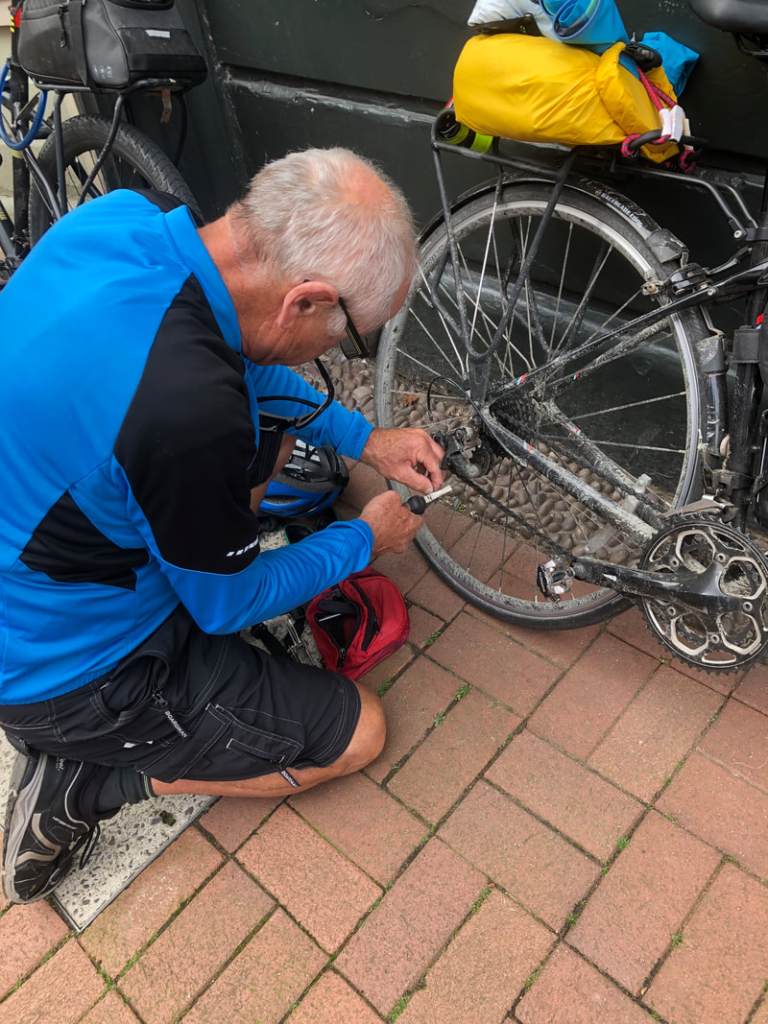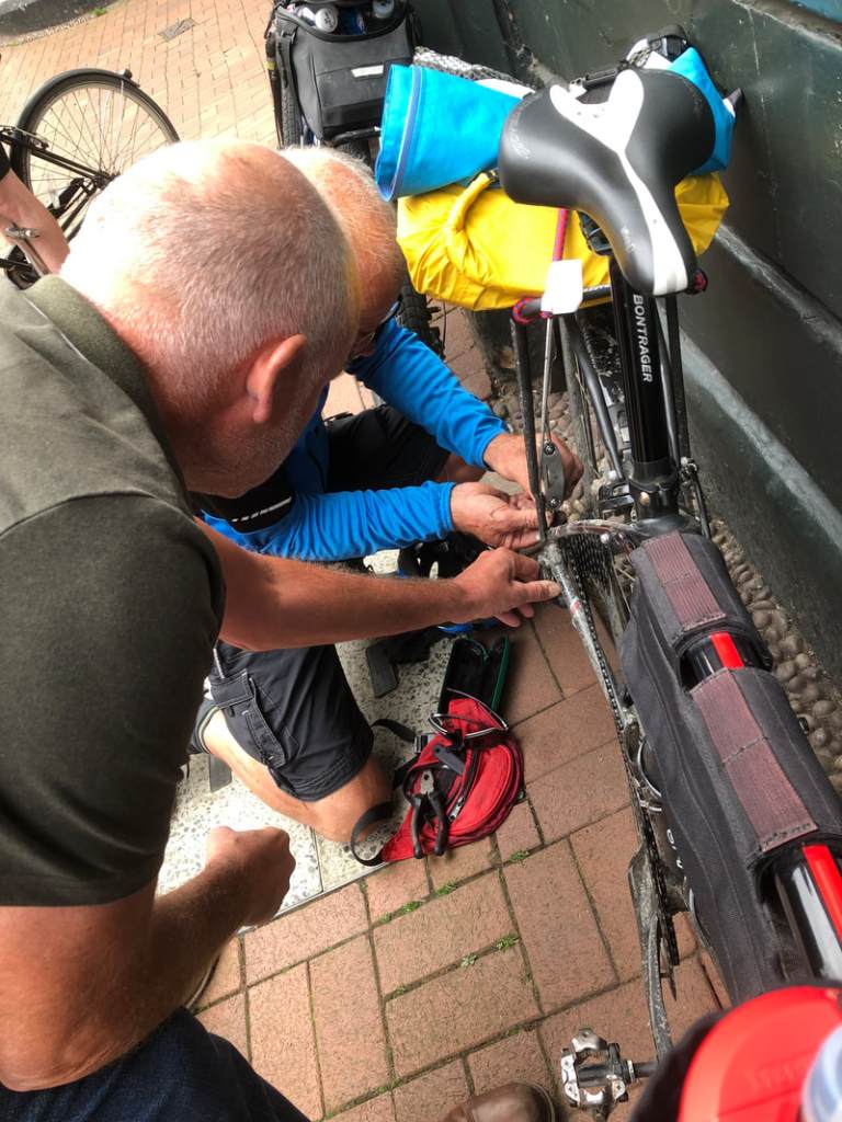 As two cyclists pedalled towards me, I simply asked the first if he was local and knew of anywhere that could fix my bike. To cut a long story short, he realised immediately that my priority was to get the bike rideable so I could complete today’s stage, and avoid a gap in my Lejog journey. He whipped out his toolkit and within minutes had snipped off the loose cable…