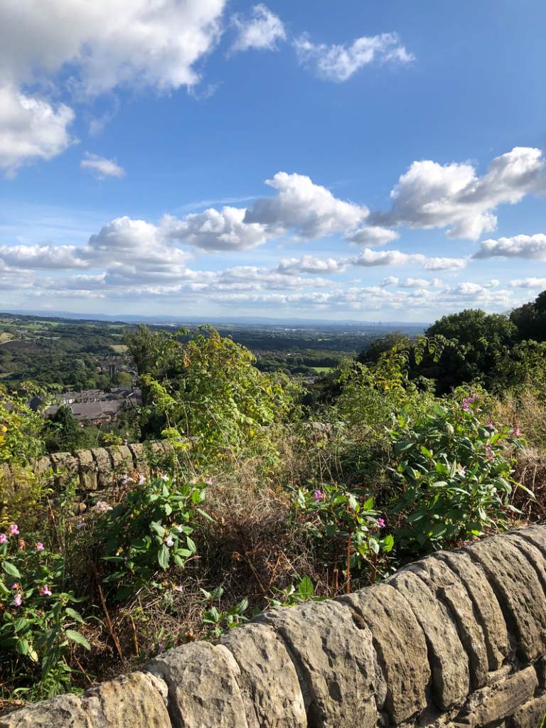 Once I’d negotiated that, while also trying to avoid the potholes and alarming quantity of broken glass in the road, I discovered that my café friend had not exaggerated. The climb from the Bury Road past the Harwood Lee golf course and on to Torrington was a lung buster, but the views were rewarding. That’s Manchester down there.