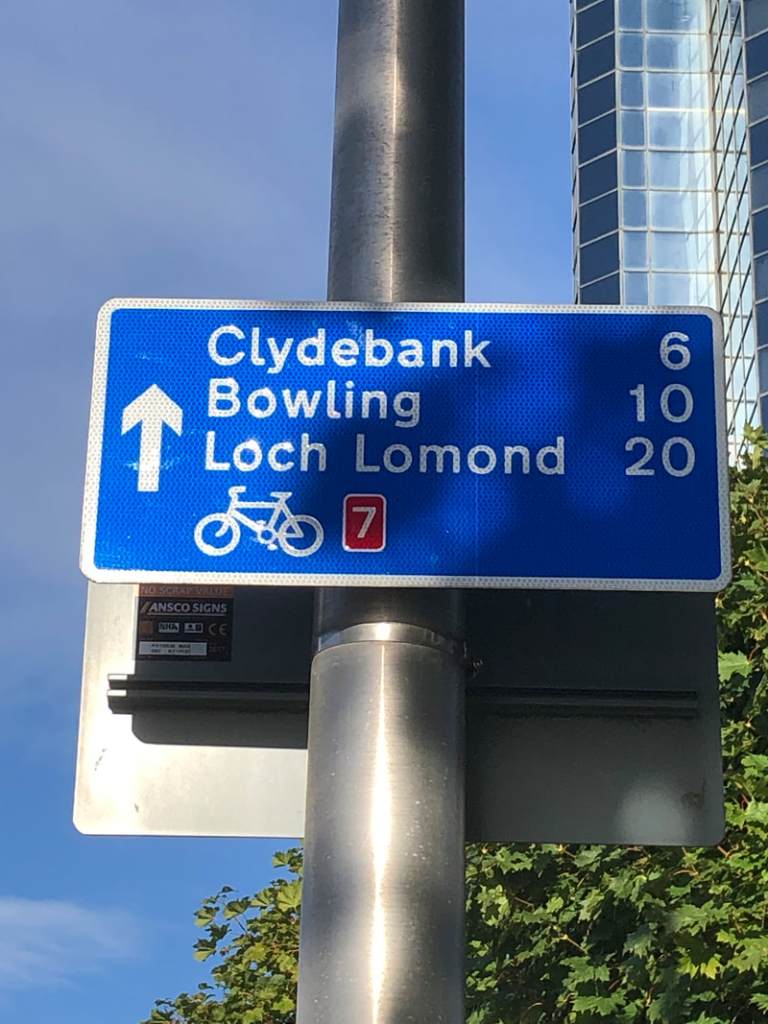 So after fuelling up with coffee, porridge and an eye-wateringly expensive thimble of fruit at Pret A Manger (altogether a snip at £8.95) I set off with the sun on my back just after 9am. The excellent National Cycle Network route 7 first took me along the Clyde…