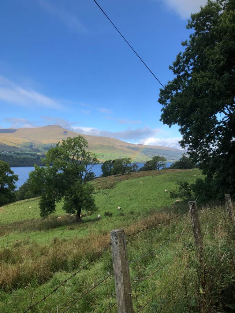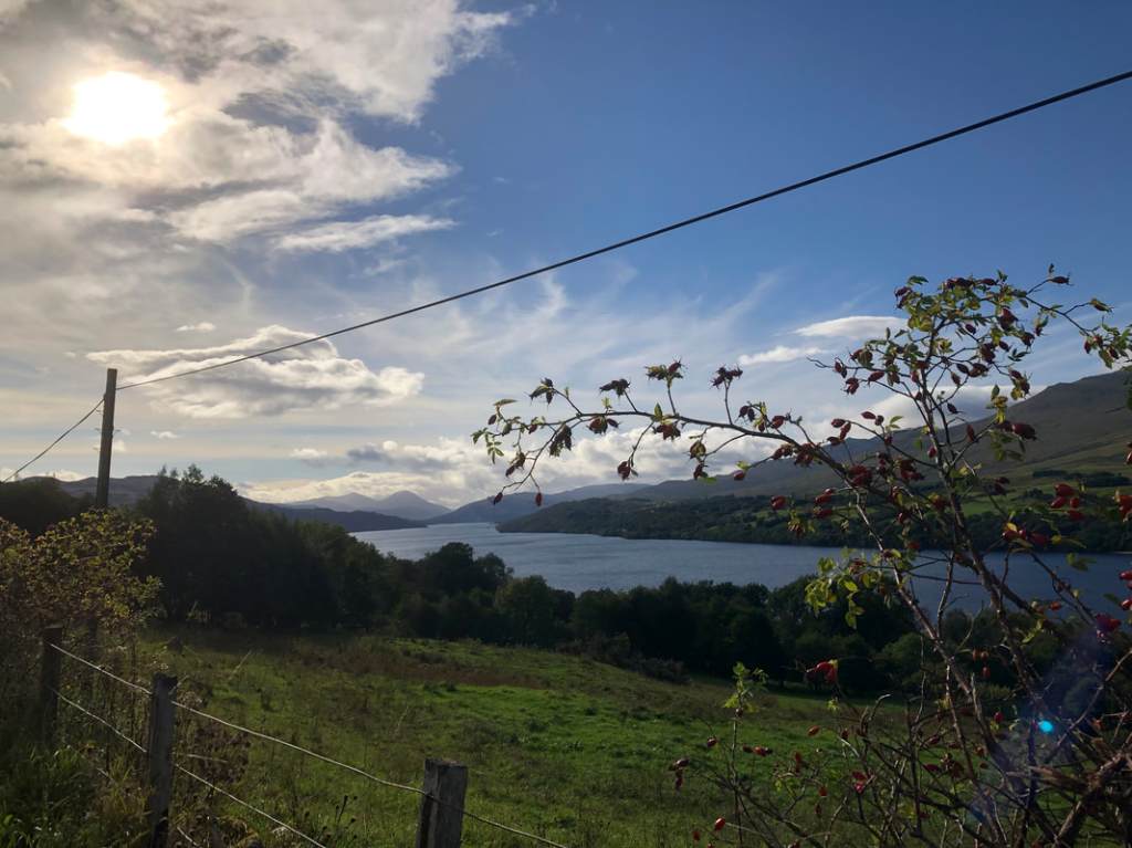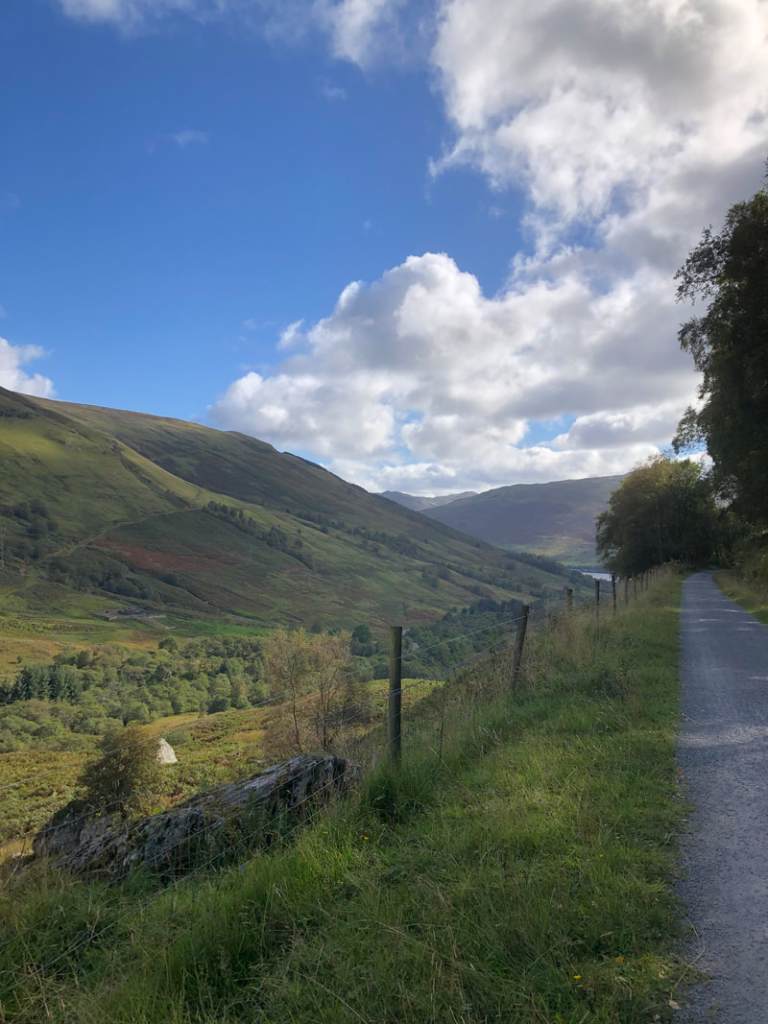 We climbed up from the beautiful Loch Earn (you’ll have to use your imagination, or Google, as I failed to get a photo, other than a glimpse of it below), onto the flanks of Glen Ogle…