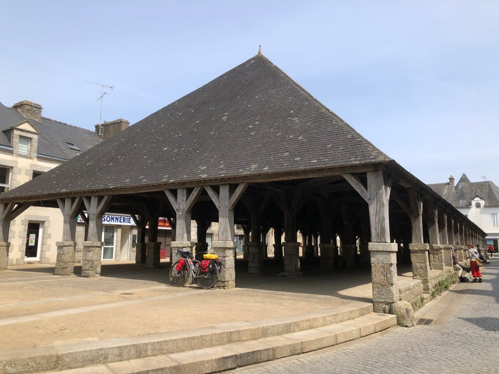 Satisfactorily caffeinated for once, we powered back up the hill to the voie verte. Lunchtime found us in the almost equally pretty town of Questembert, with its historic market hall…
