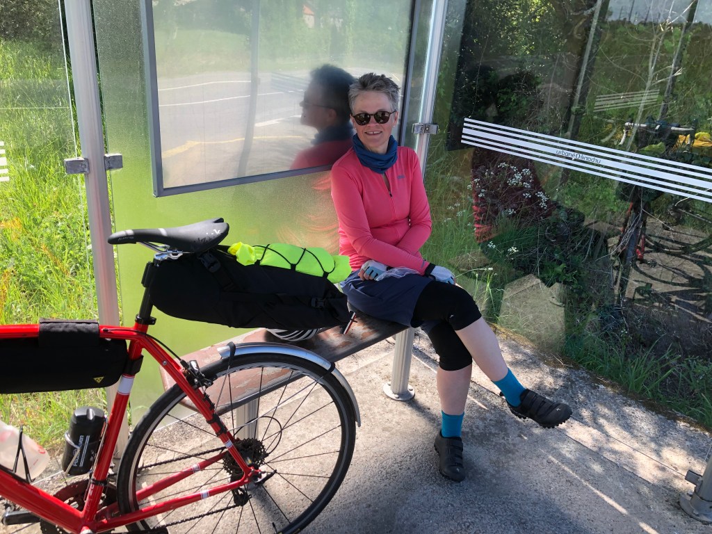 Though after a longish spell uphill, into the wind and in the sun, a break was in order, and this bus shelter was just the job