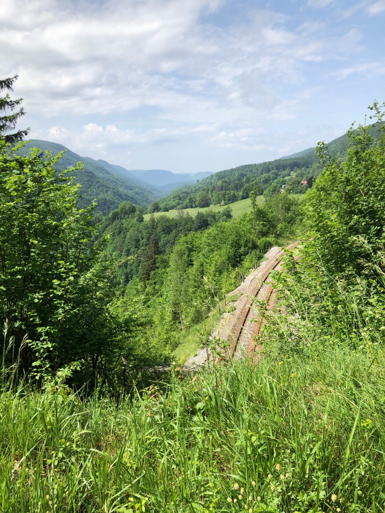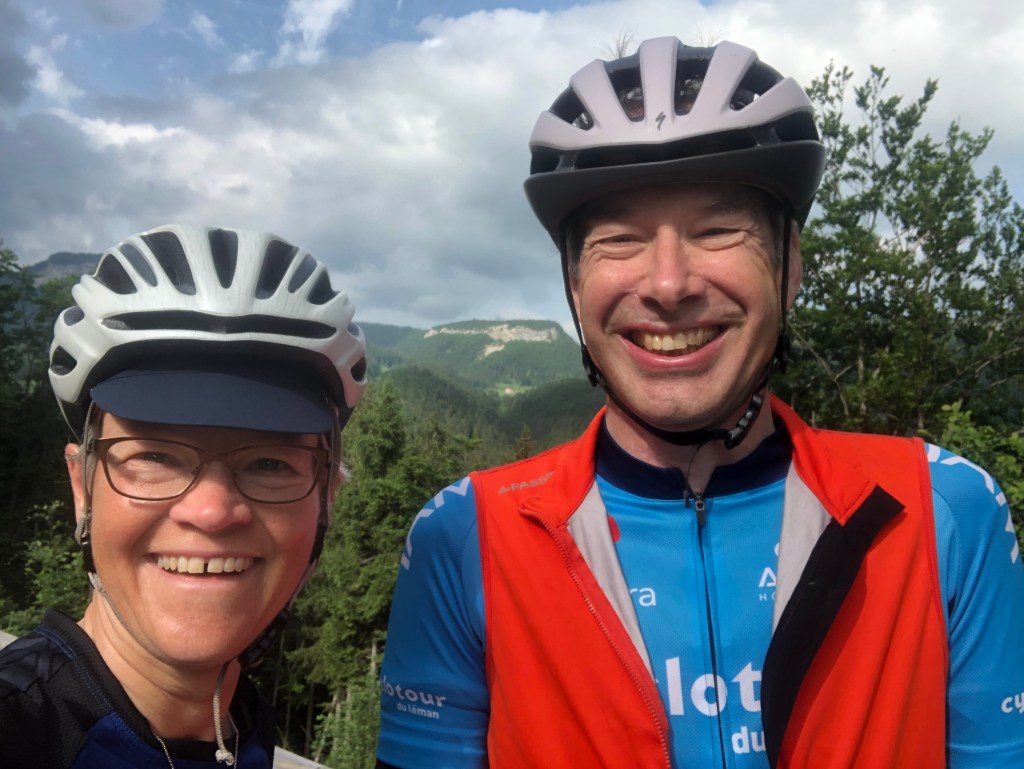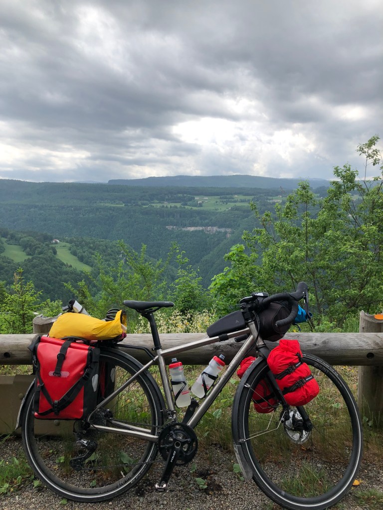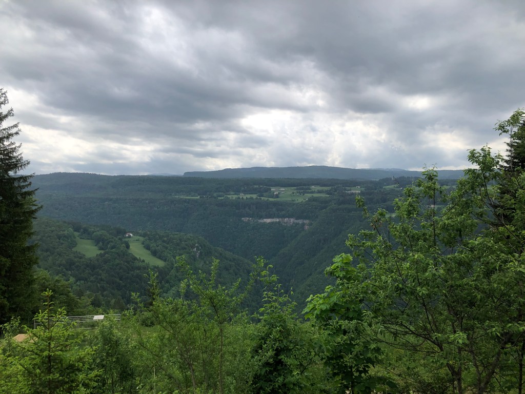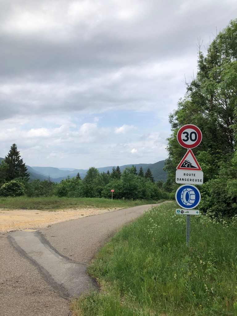 So we took the scenic option, setting off from Lajoux. Bernard much preferred his first ride on a bike carrier to travelling in the bowels of a bus, and notwithstanding a few spots of rain and rumbles of thunder, we all enjoyed the first 10k along the plateau…
