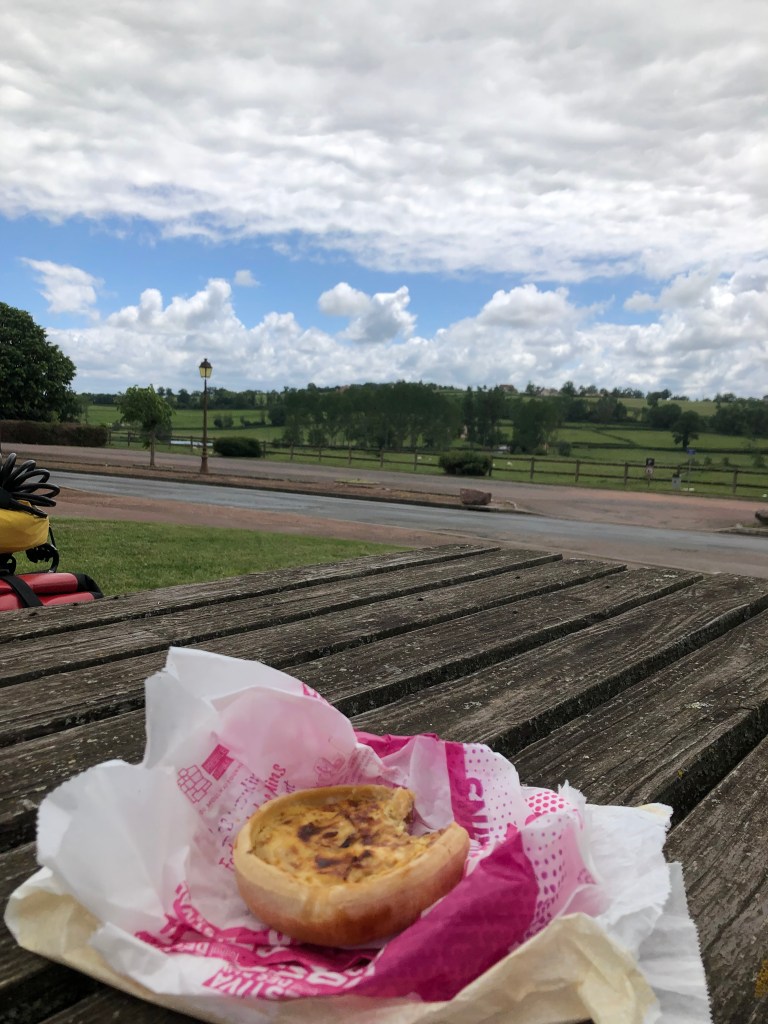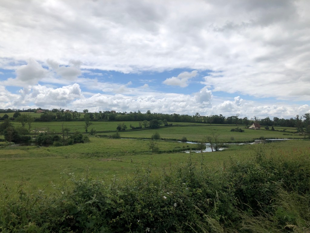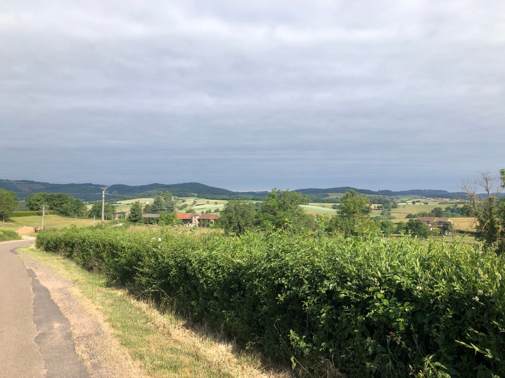 Sadly, despite signs to the contrary, what it didn’t have was a boulangerie, but fortunately my Mary Poppins panniers supplied me with a yoghurt, a cereal bar, and a banana for breakfast. No need for talking umbrellas, but a coffee would have been nice – I didn’t find anywhere to give me one until midday. The sun was shining at 9am but those clouds soon cooled things down.