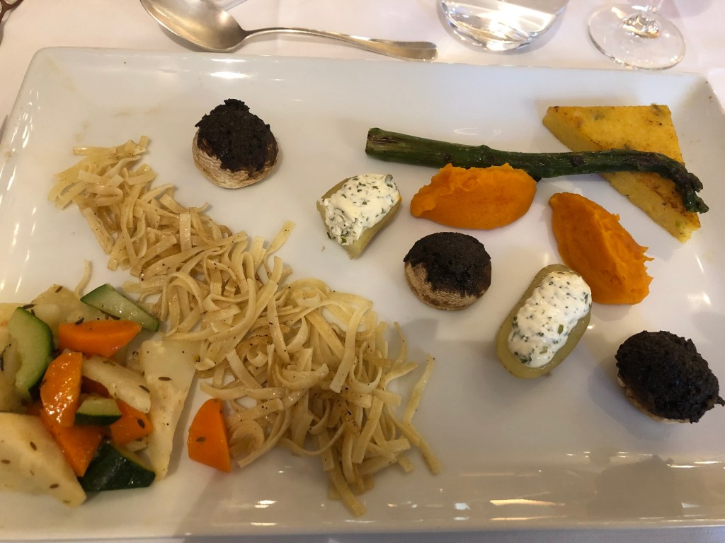 At dinner last night, my attempt to introduce a veggie main course into the set menu caused the waiter such consternation (think Michael Palin in A Fish Called Wanda, thankfully without the chopsticks up his nose) that I gave up and chose what he called ‘une grande assiette végétarienne’, spreading his arms wide like a fisherman talking up his catch. I think perhaps he was referring to the crockery, and not the contents, but it was tasty and attractively presented, if not especially filling.