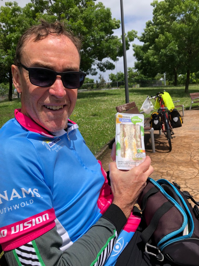 It wasn’t unremittingly wet though. Jon even got his sunglasses out at lunchtime. We ate our gourmet picnic lunch in a children’s playground overlooking the French border.