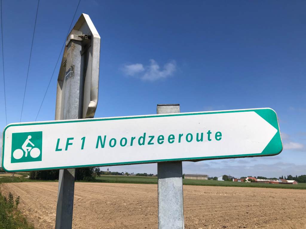 The twisting and turning both made for a more interesting ride and ensured I didn’t always have the wind in my face. At one point we joined the North Sea Cycle route, which was signposted in (I assume) Flemish: LF is the Dutch acronym for a cycle route:
