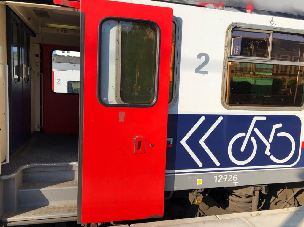 When my next train arrived – oh joy: step-free access, and an entire carriage of flip-up seats to allow room for bikes. However, take careful note of the steps visible beyond the door..