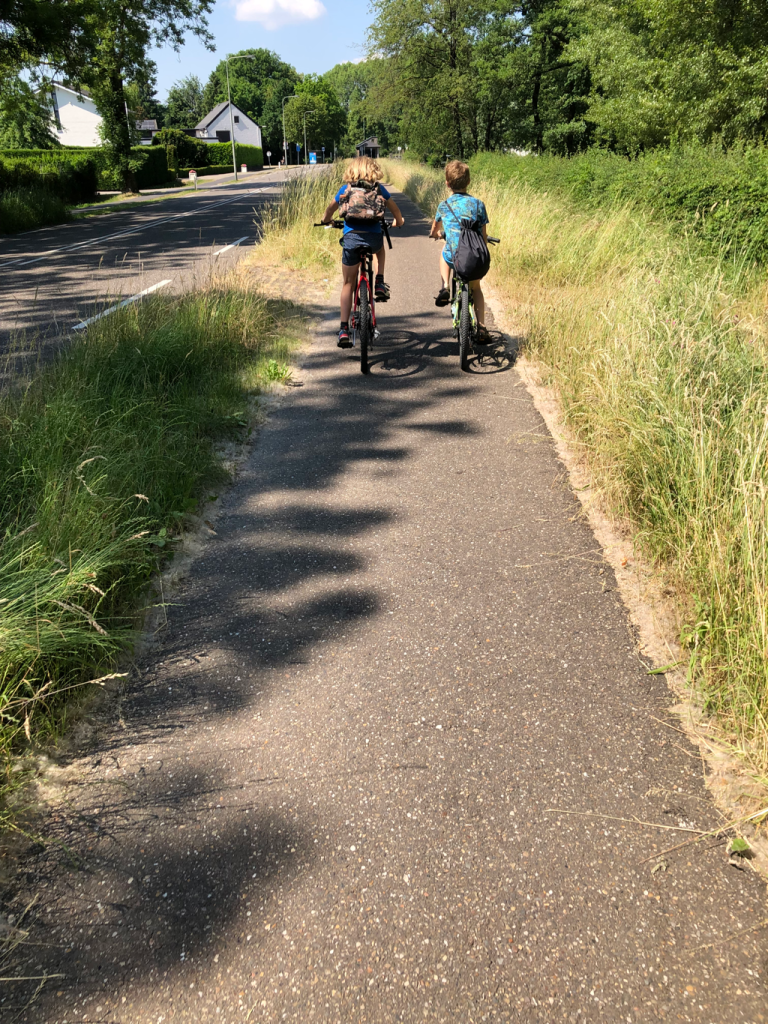 And as we wove through the streets of old Maastricht we made our first acquaintance of Dutch cycling culture. There were a few too many cobbles for Bernard’s liking, and Guillaume found the knooppunts (nodes) hard to follow. As for me, the cycle paths were fantastic but I found it all a bit overwhelming, in the same way as Bruges had been. I suspect that until I’ve acclimatised to the rules and customs, I will be in greater danger of being mown down by a bike than a car, because they come at you from all angles and I might behave in a way they aren’t expecting. I was quite happy to get out of town and enjoy wholesome sights like this: two boys who can’t have been older than 10, riding to football practice on their own