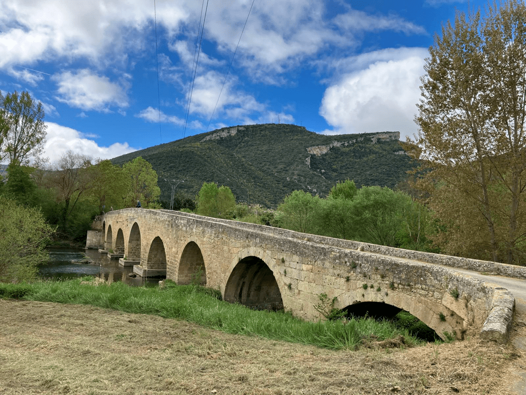 With the contents of my mid-morning bollo coursing through the bloodstream, Bernard and I made short work of the next few miles. Fortunately, Jonis’s customary choice of a napolitana de chocolate (pain au chocolat for francophile readers) had a similar effect on his performance. Following the Ebro upstream, we wove through the dramatic limestone canyon of the Desfiladero de la Horadada, with granite pinnacles and bluffs looming above our heads. It was pointless trying to capture the majesty of such scenery in a photo, so you’ll have to make do with a distant shot across an attractive old bridge.