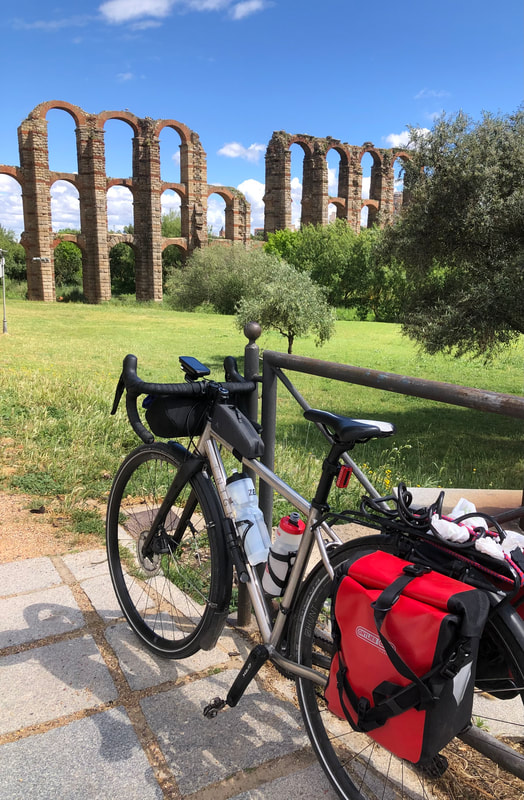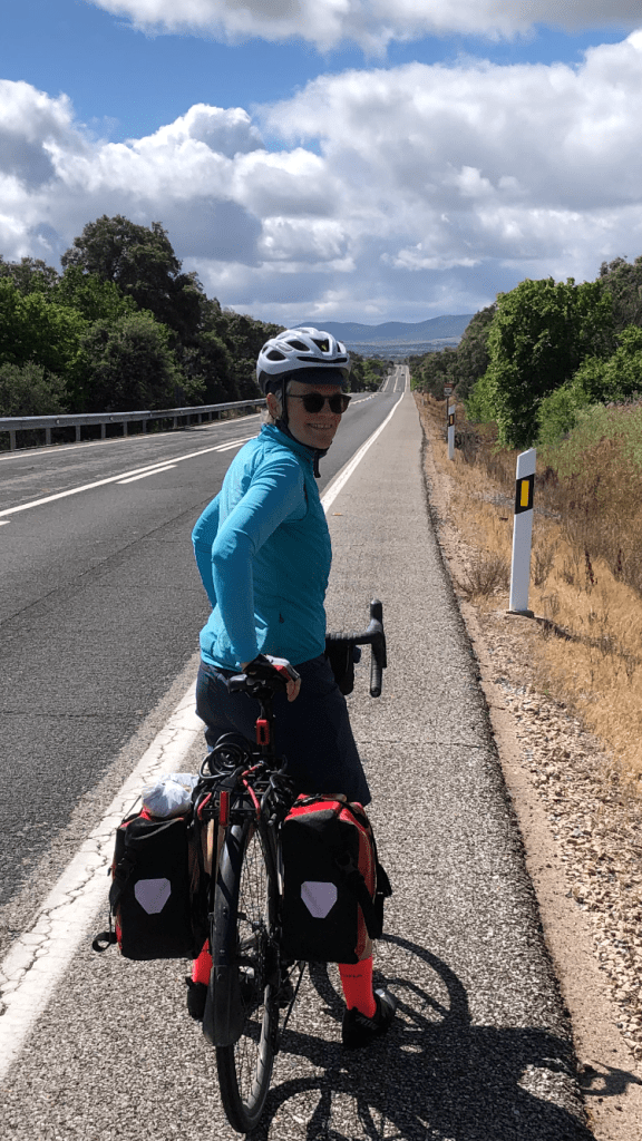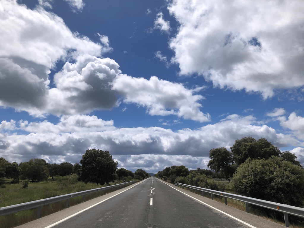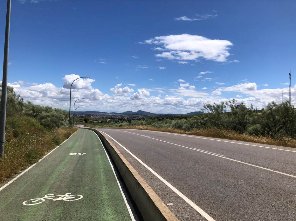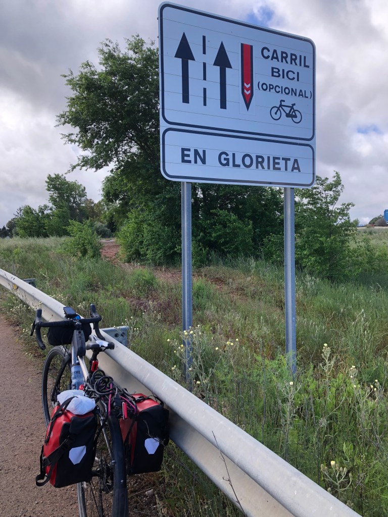 Our destination today was once a major Roman city, and someone must have left an offering for us with the cycling gods. First, they provided shelter, in the form of Cáceres’ train station, from a sudden downpour. And after that, good signs and portents came thick and fast (word of the day: glorieta – roundabout):