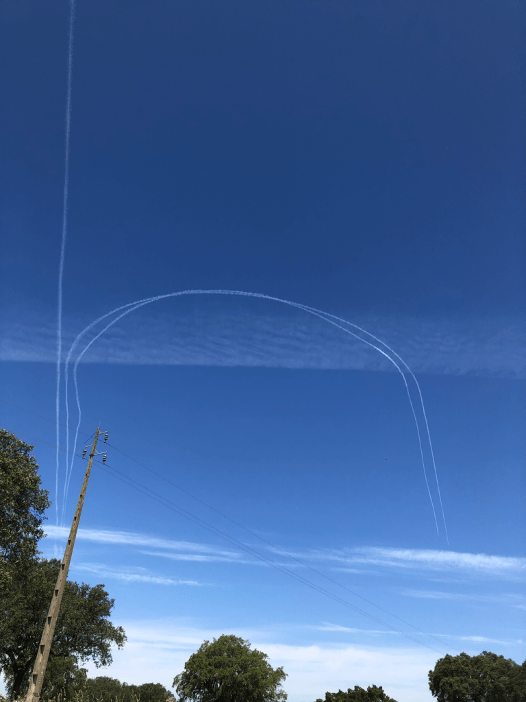 And this intriguing trio of contrails. What was going on, we wondered: had two military jets been scrambled to intercept a commercial flight they feared had gone rogue? Or perhaps they were skywriters, trying to say hi? Suggestions on a postcard please.