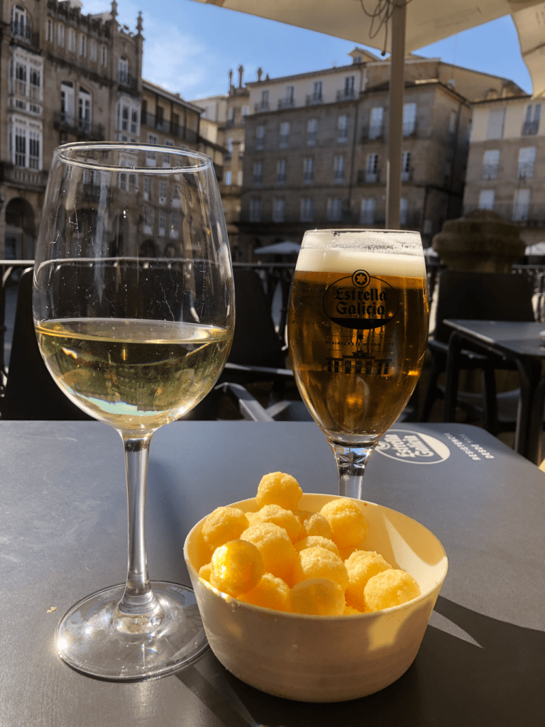 Where we toasted the end of our journey with local produce: Estrella Galicia and Ribeiro – and a bowl of cheese puffs. I’m sure Bernard and Colin saw the funny side