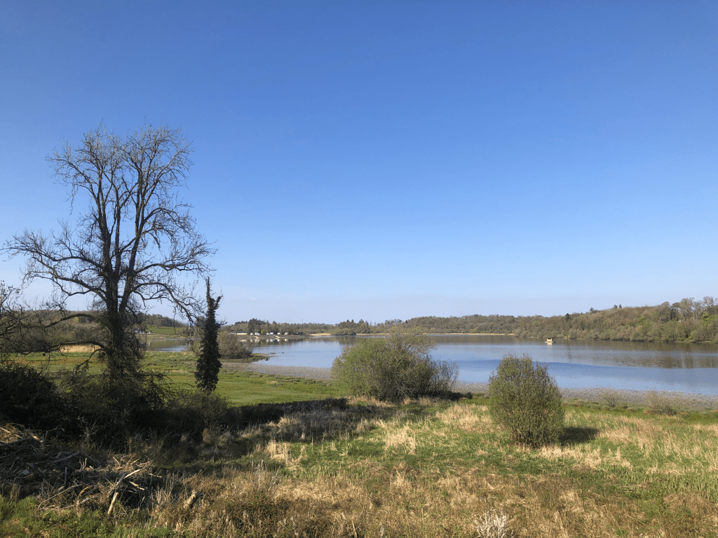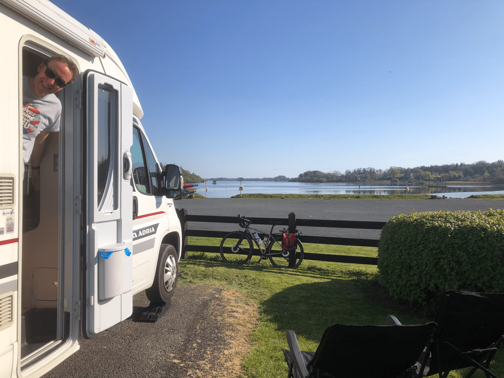 At the end of a long hot day, this was a cheering sight – Midge (one of those white dots in the distance) parked up beside the cool waters of Lough Rynn