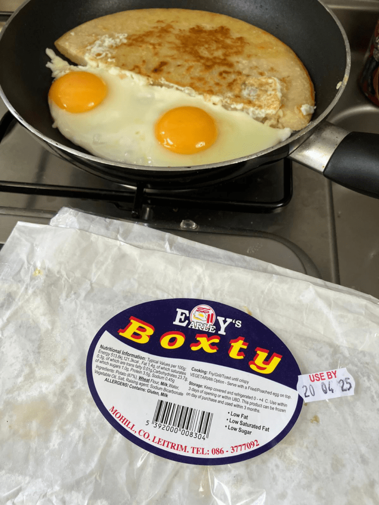 A pack of the enigmatically named Boxty was the second. It turned out to be a dense potato pancake, about a centimetre thick. We followed the packet’s suggestion of a ‘vegetarian option’, and fried it with eggs. Delicious.