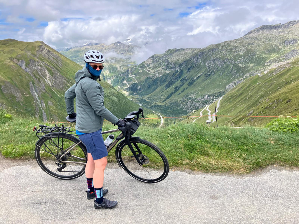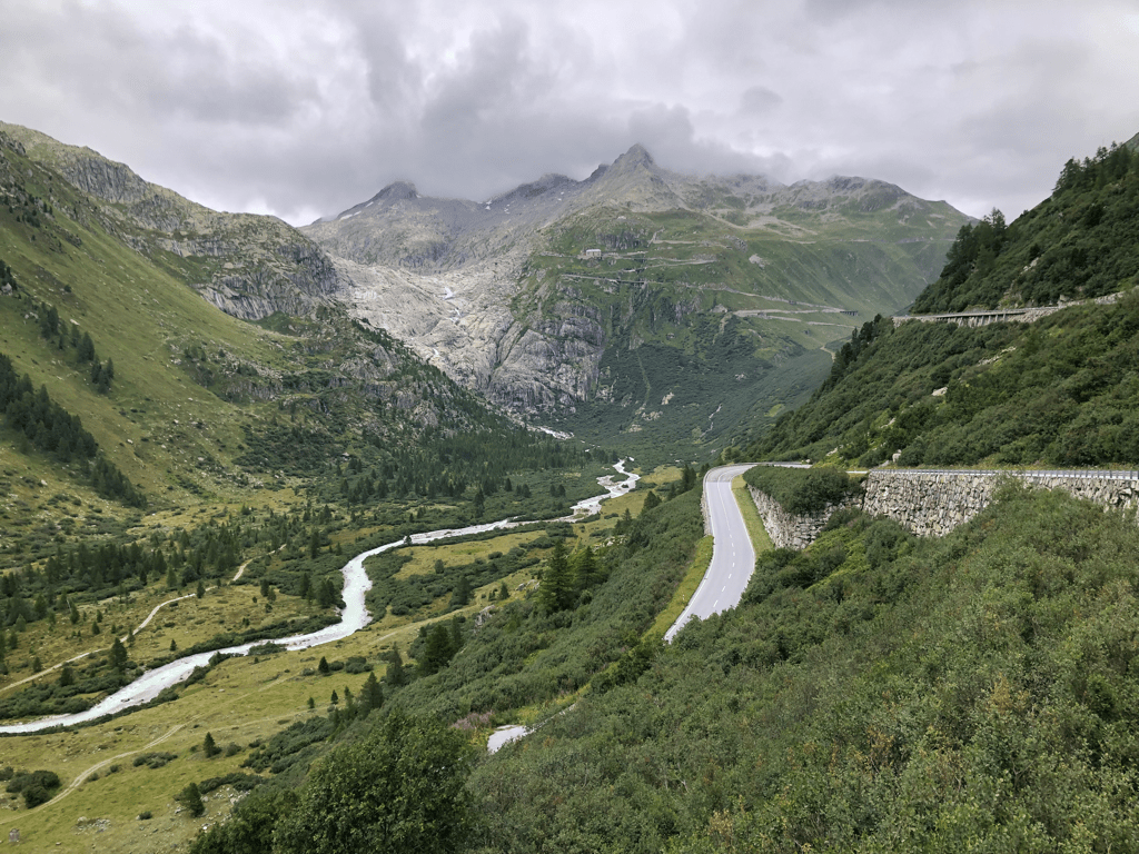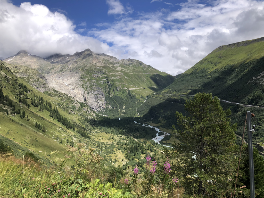 All downhill from there then? Not quite, but initially at least. Having learned my lesson from the Oberalppass, I wrapped up for the descent to Gletsch, which conveniently offered a glimpse (that zigzag line above Bernard’s handlebars) of my next challenge