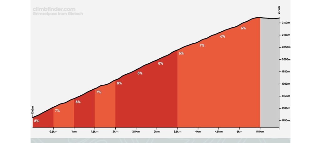 According to Cycloworld.cc, I’d picked the harder side to climb: 12.4k from Realp, with gradients of around 8-9%. Or in the words of the young local cyclist I exchanged greetings with this morning: “It is much up”.