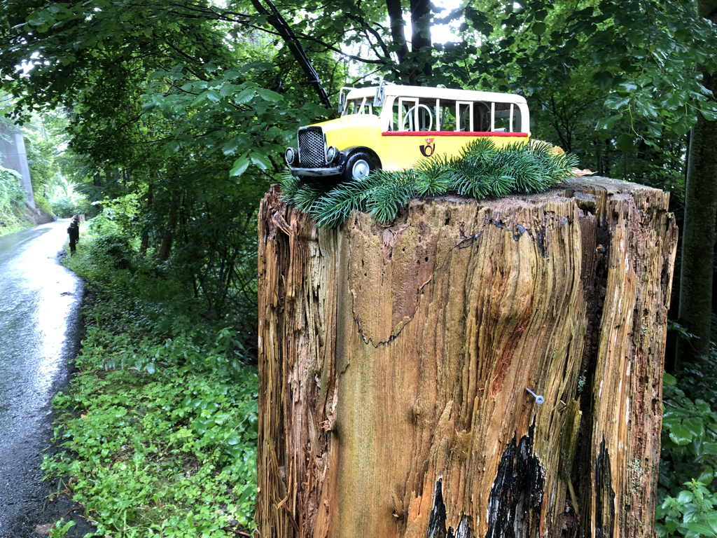 This cute little tribute to the ubiquitous yellow Post Buses that serve even the remotest spots in the country: