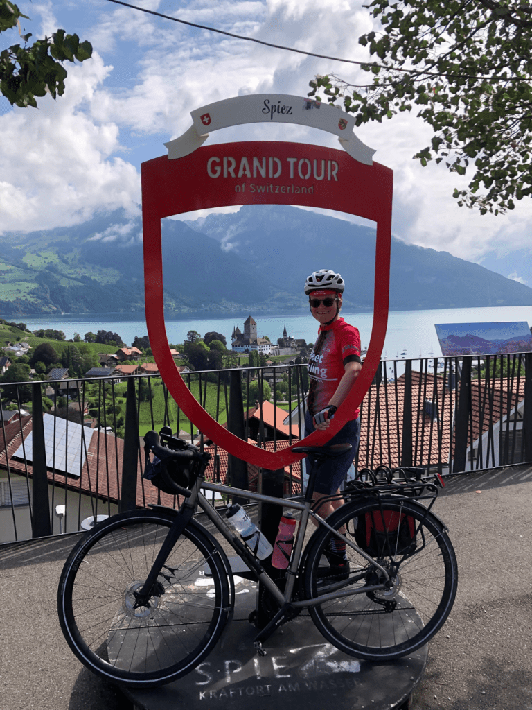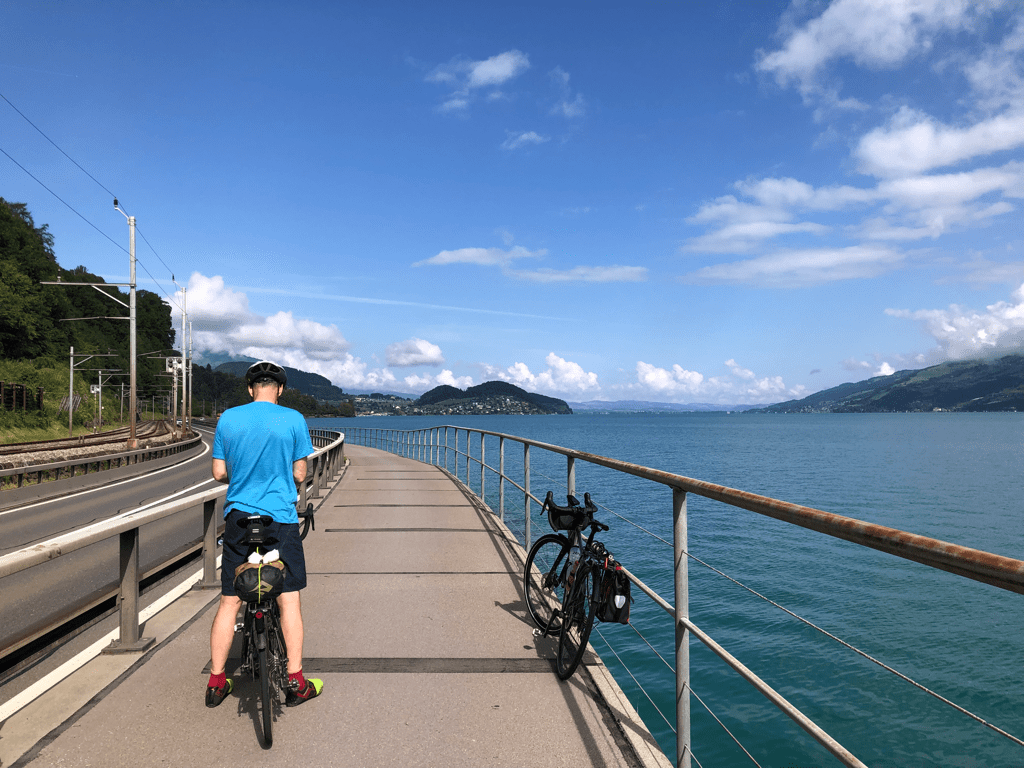 We began with a glorious flat warm up along the shores of Lake Thun, where cyclists vied with train passengers for the best view:
